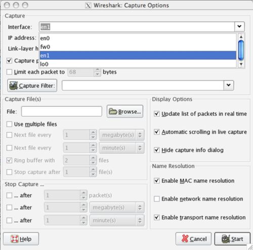 必要に迫られて Windows/MacOS 両方の環境で WireShark を使わなければならなくなった。Windows 版はコレをダウンロードしてそのままサクっと起動して OK。MacOS X 用はコレをダウンロードしてそのままサクっと起動したら…インタフェースがなんにも見えなか…